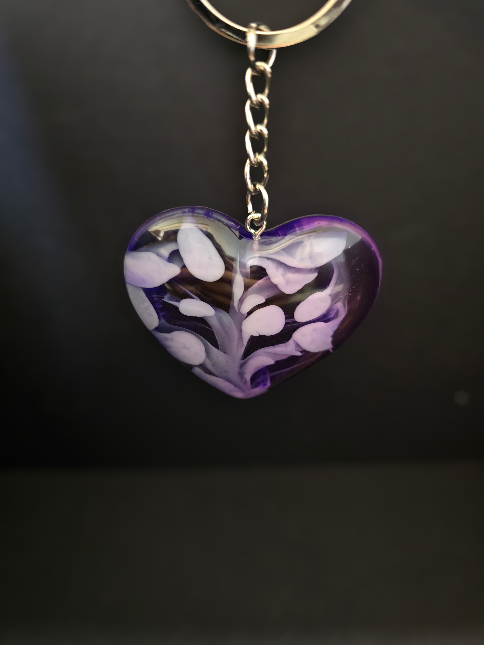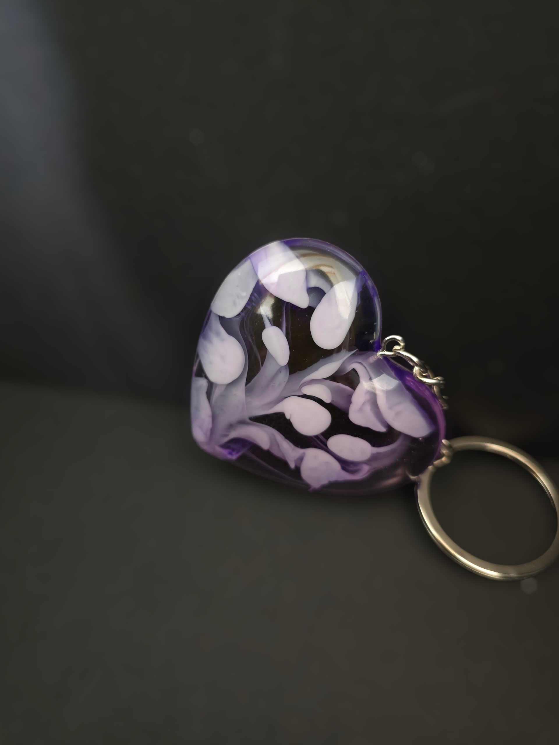 Draag een stukje kunst altijd bij je! Deze unieke sleutelhanger heeft een prachtige hartvorm met een diepe paarse kleur en sierlijke witte patronen die doen denken aan bloemblaadjes of verfijnde rookpluimen. Het speelse en elegante design maakt dit accessoire een echte blikvanger.
