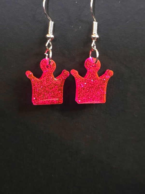 Shine like royalty! Deze speelse, handgemaakte oorbellen in de vorm van een kroon zijn gevuld met sprankelende hot pink glitter.