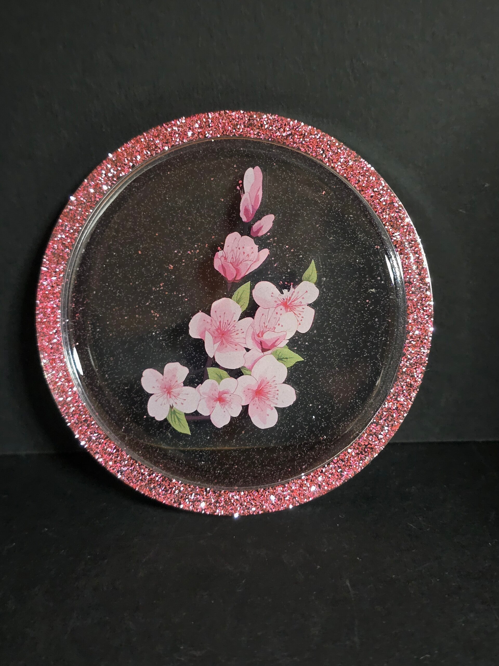 Geniet van de tijdloze elegantie van sakura (kersenbloesem) met deze betoverende onderzetter. De fonkelende roze glitterrand omlijst een delicate bloesemtak. Een subtiele en stijlvolle toevoeging voor elk moment.