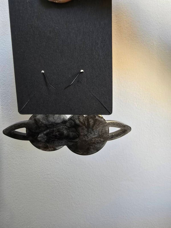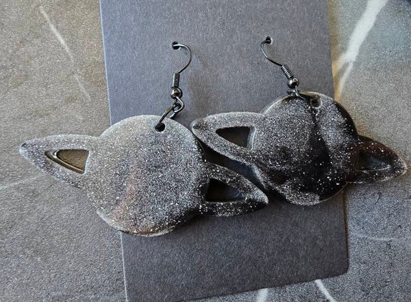 Deze betoverende Saturnus oorbellen nemen je mee naar verre sterrenstelsels! Gemaakt van glinsterend zwart hars met zilveren glitters, lijken ze net op kleine planeten in de nachtelijke hemel. De donkere, moderne oorhaken maken de 'space chic' look compleet.