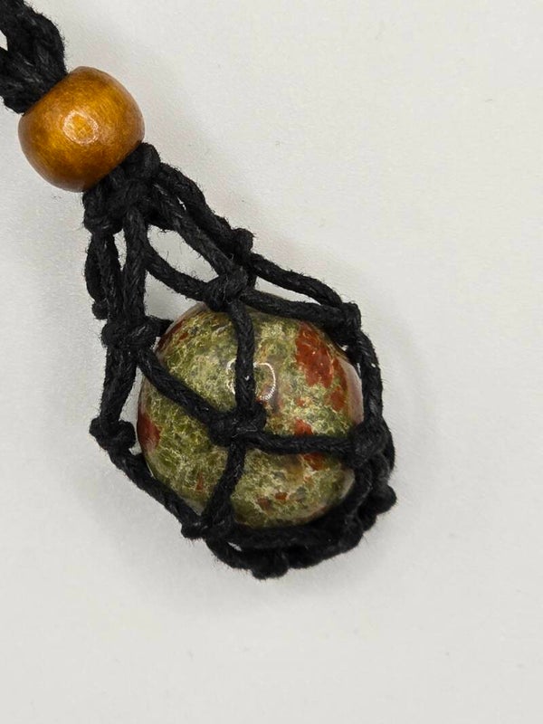 Voel je verbonden met de natuur met deze prachtige, handgeknoopte ketting. In het stevige zwarte netje zit een Unakiet edelsteen. Deze steen staat bekend om zijn aardende werking en helpt je om in het 'nu' te leven. De kleuren – mosgroen gemengd met warm terracotta – geven de steen een unieke, krachtige uitstraling.