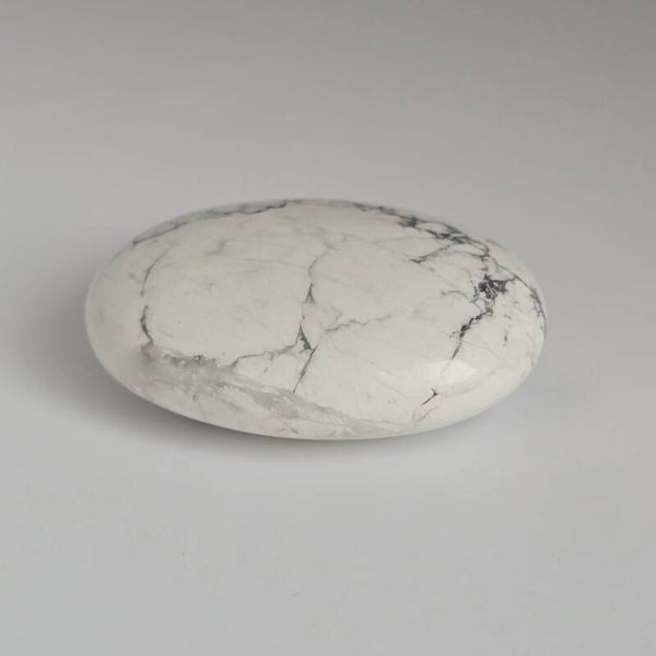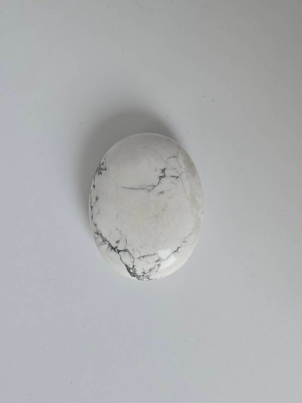 Deze Howliet is met precisie geslepen en hoogglans gepolijst tot een comfortabele, ovale vorm. Door zijn afmeting en gladde afwerking ligt de steen perfect in de hand, wat hem uitermate geschikt maakt om vast te houden tijdens meditatie, of om in je zak of tas mee te dragen.