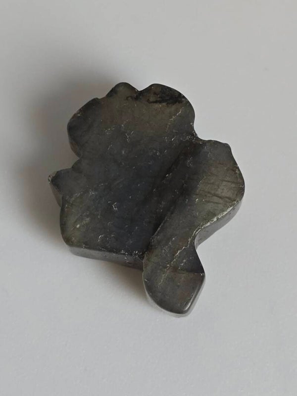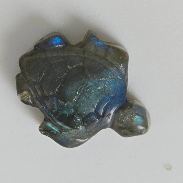 Ontmoet dit unieke, met de hand gesneden schildpadbeeldje, vervaardigd uit de fascinerende edelsteen Labradoriet.