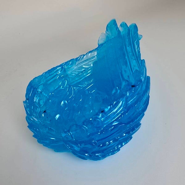 ​Het object is uiterst gedetailleerd, met gestructureerde 'veren' of 'golven' die de illusie van beweging creëren. Door de transparantie van de epoxy lijkt het object vanbinnen te gloeien wanneer het wordt geraakt door zonlicht of een spot.