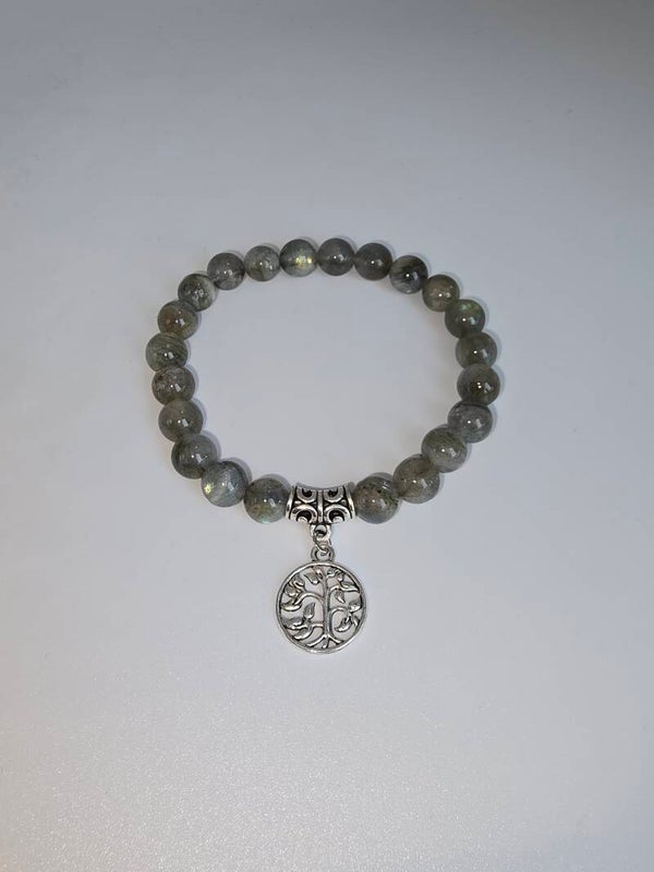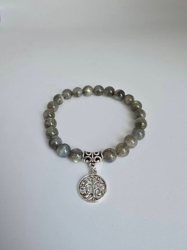 De armband is geregen met hoogwaardige, gepolijste kralen van Labradoriet. Hoewel de steen op het eerste gezicht grijs en bescheiden lijkt, vangen de kralen bij beweging het licht op en onthullen ze de spectaculaire blauw-groene en gouden flitsen (Labradorescentie).