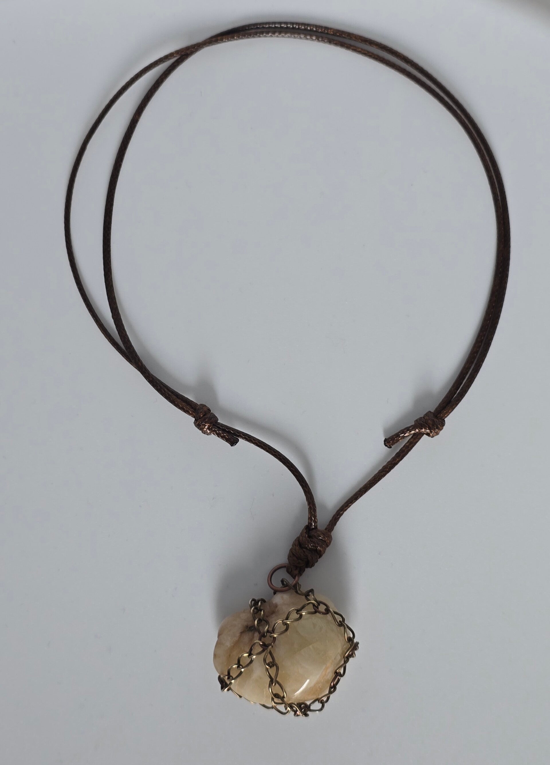 Draag een warm stukje natuur met deze handgemaakte ketting. Centraal hangt een gladgepolijste, zachtgele edelsteen, veilig gevat in een stoere metalen kooi van fijne goud- en bronskleurige kettinkjes. De hanger hangt aan een stevig, warmbruin koord met een robuuste knoopafwerking. De ketting is eenvoudig in lengte te verstellen, waardoor hij altijd perfect past. Een stijlvol en origineel sieraad met een natuurlijke uitstraling, ideaal voor elke dag.