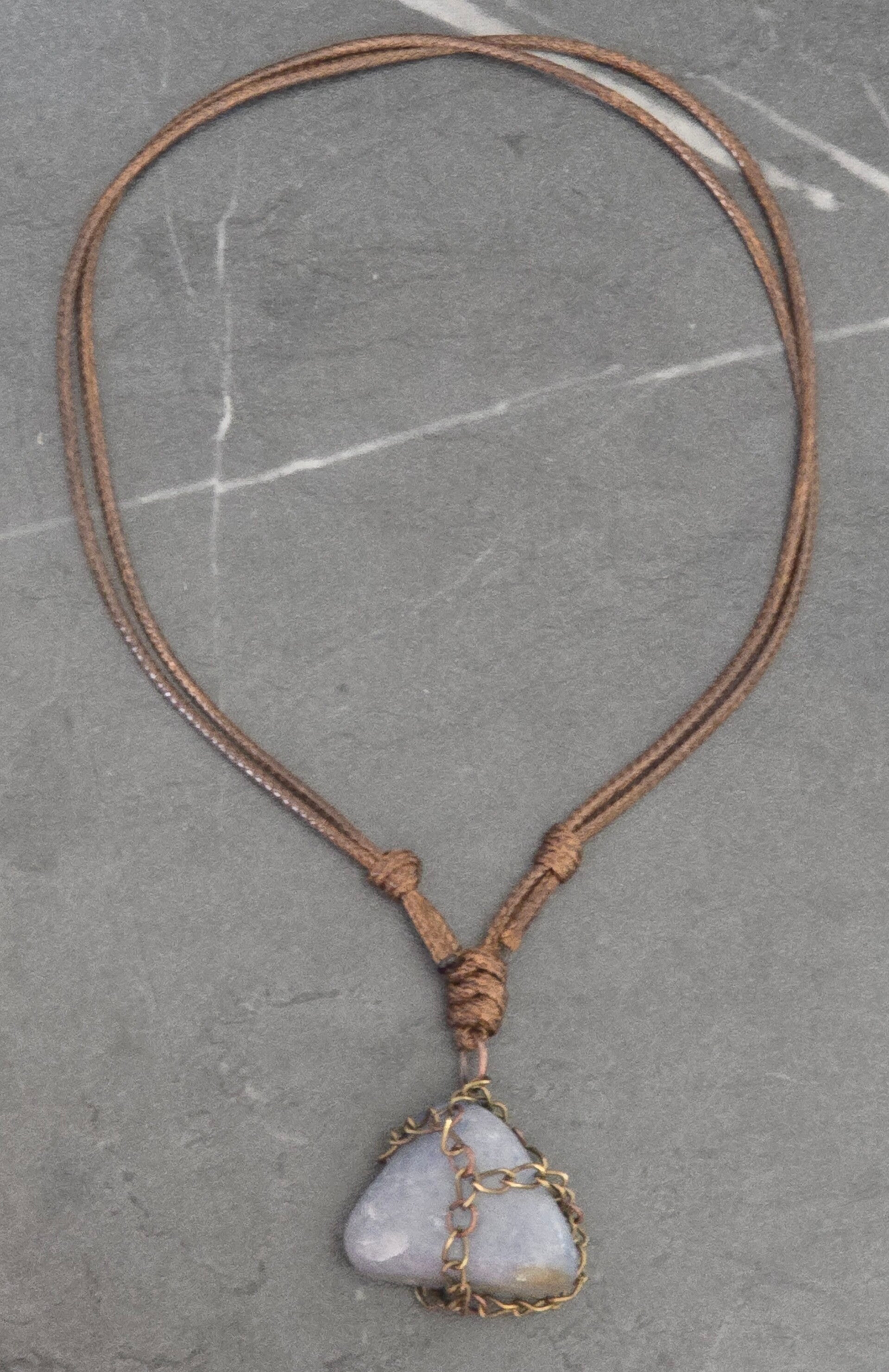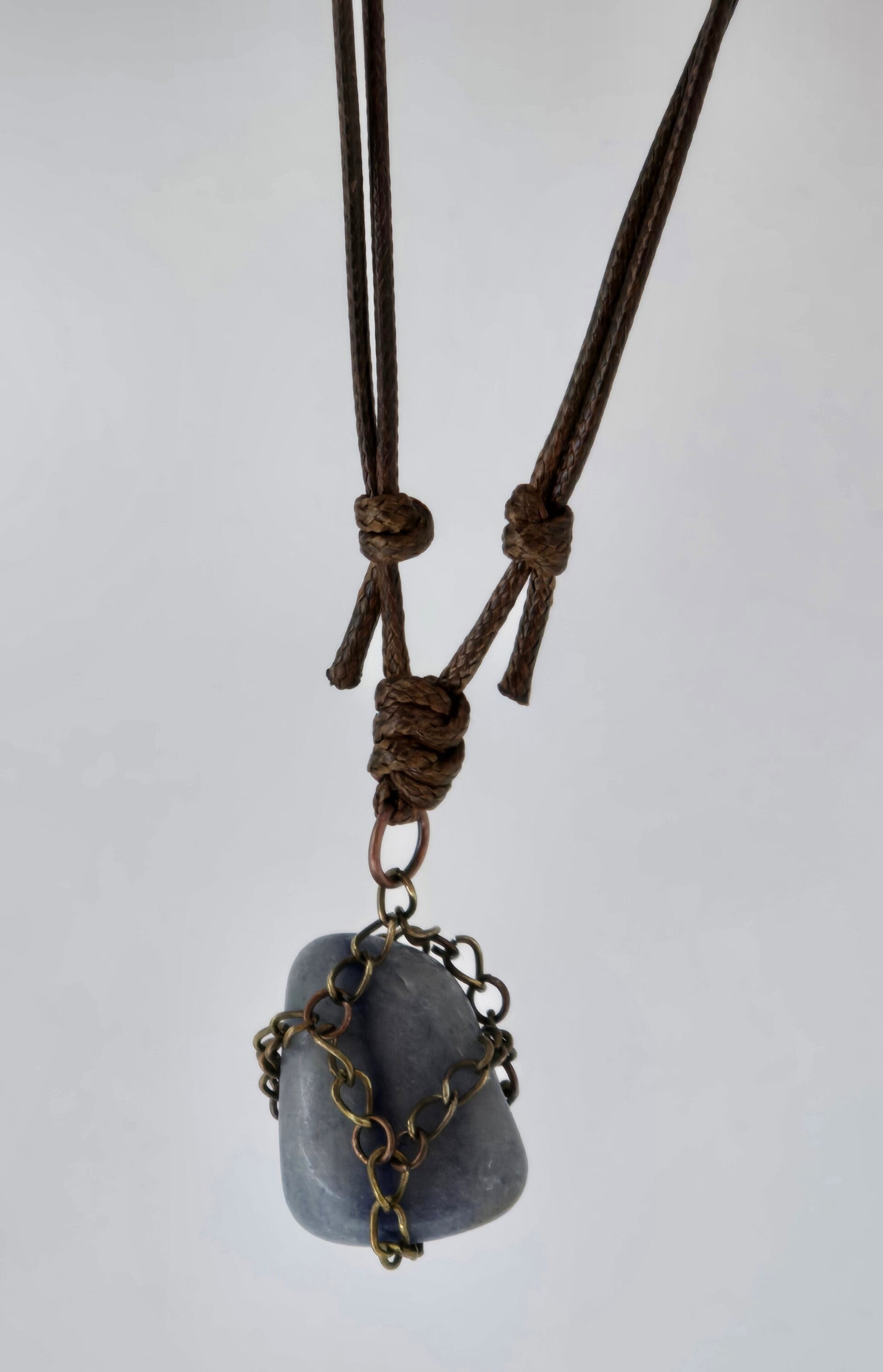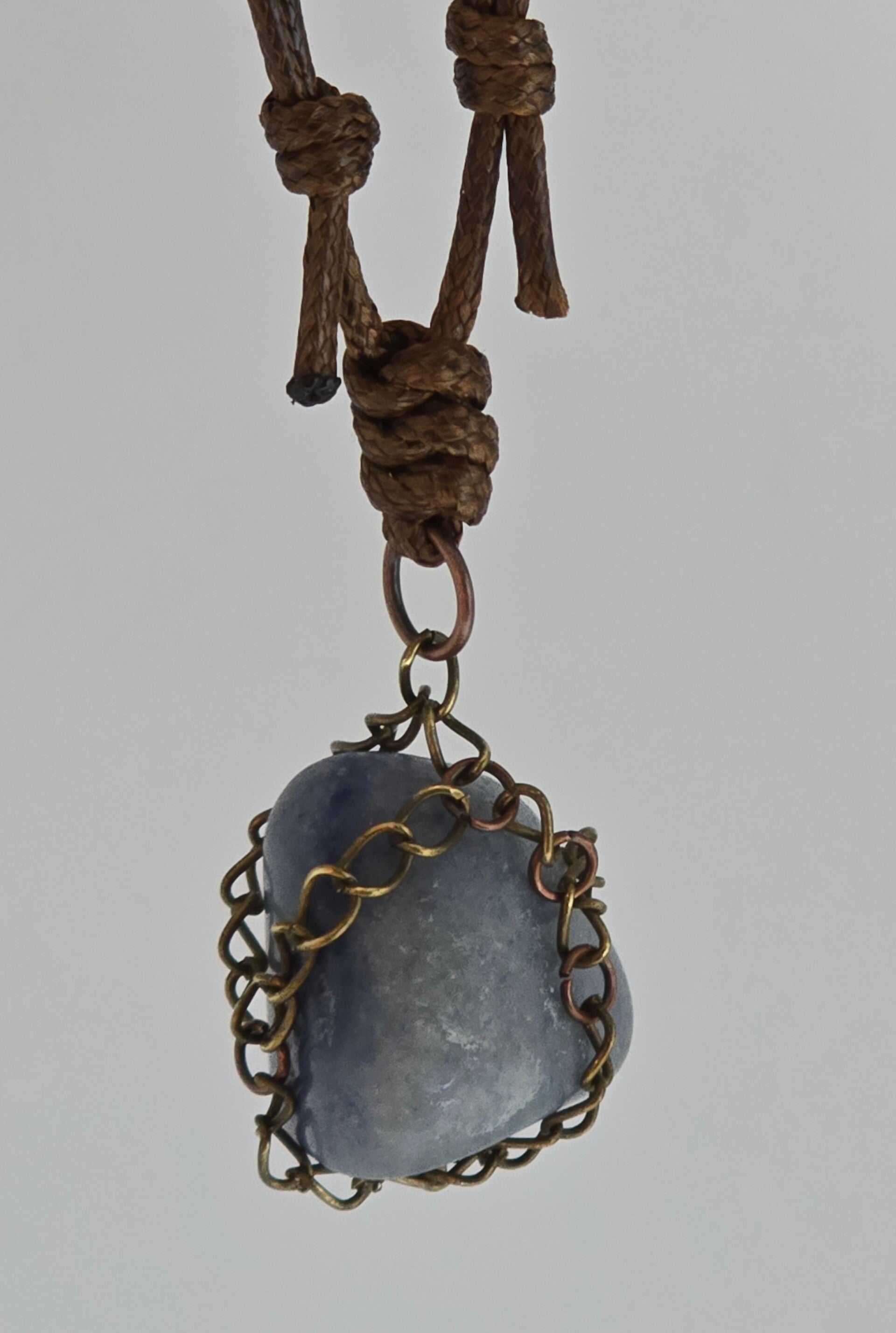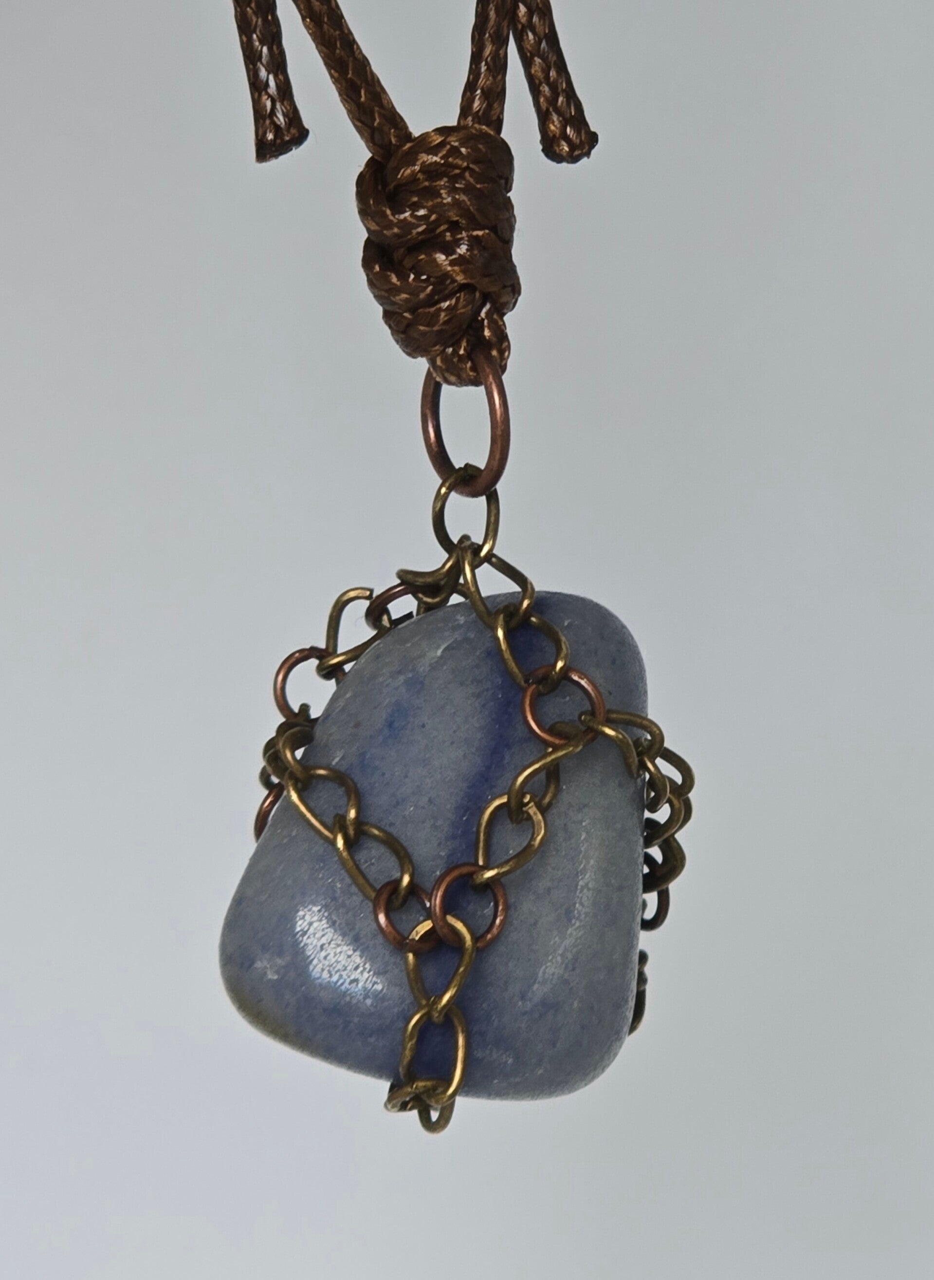 Draag een uniek stukje natuur met deze handgemaakte ketting. Centraal hangt een gladgepolijste, blauwe aventurijn edelsteen, veilig gevat in een stoer jasje van fijne, goud- en bronskleurige metalen kettinkjes. De hanger hangt aan een stevig, warmbruin koord met een stoere knoopafwerking. De ketting is eenvoudig in lengte te verstellen voor de perfecte pasvorm. Een stijlvol en origineel sieraad met een natuurlijke, bohemian uitstraling, ideaal voor elke dag.