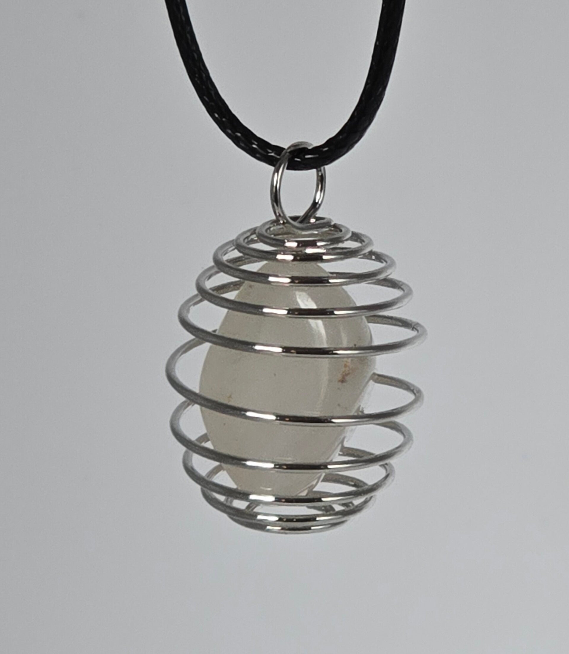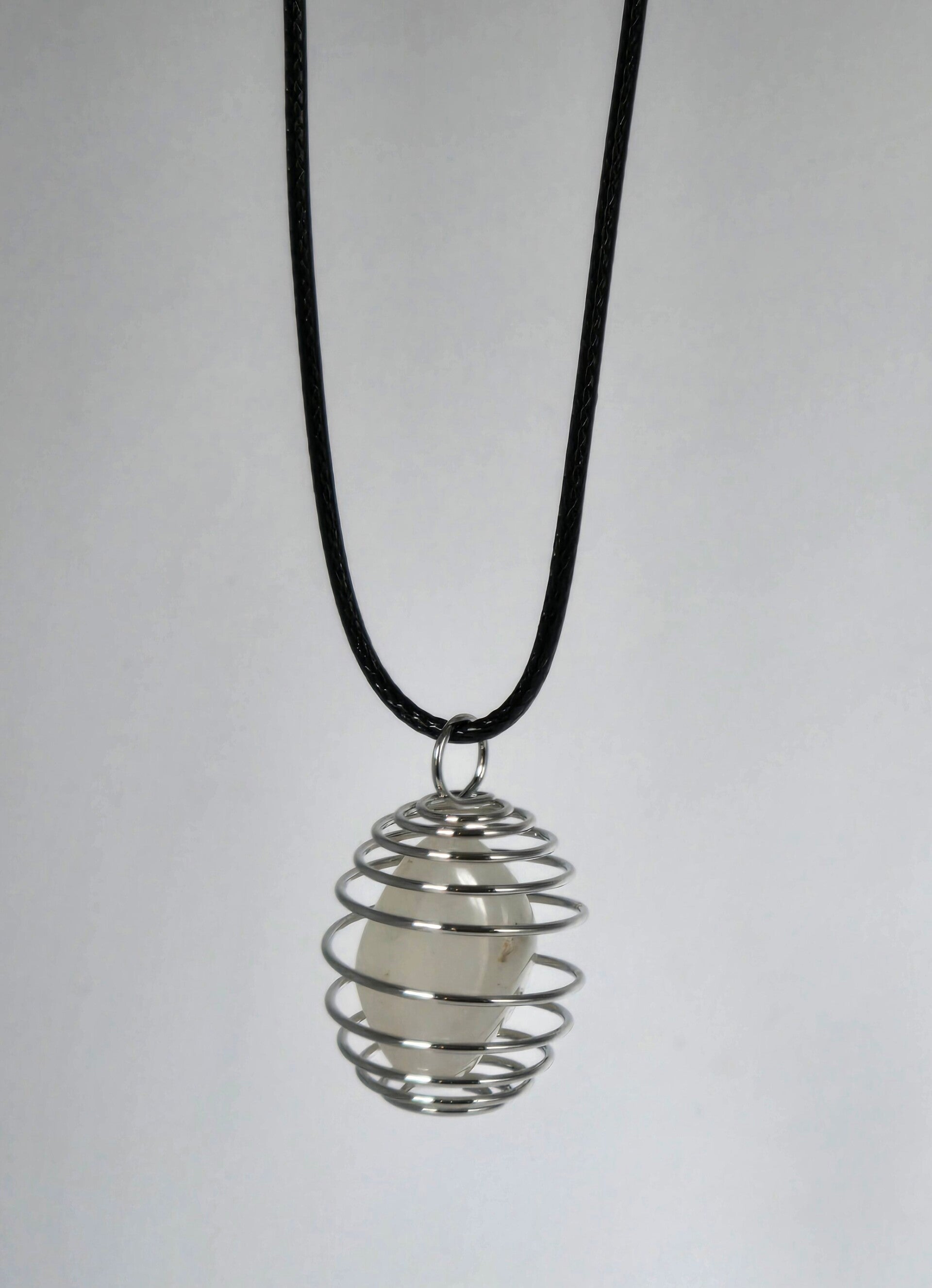 Mooie, minimalistische ketting met een witte natuursteen (bergkristal-look) in een zilverkleurige spiraalhanger. De 'spiral cage' is flexibel, waardoor je de steen eventueel kunt verwisselen. De hanger hangt aan een zwart waxkoord met een verstelbare sluiting, zodat de ketting altijd op de juiste hoogte valt. Het sieraad is in uitstekende staat en past door de neutrale kleuren bij elke outfit.