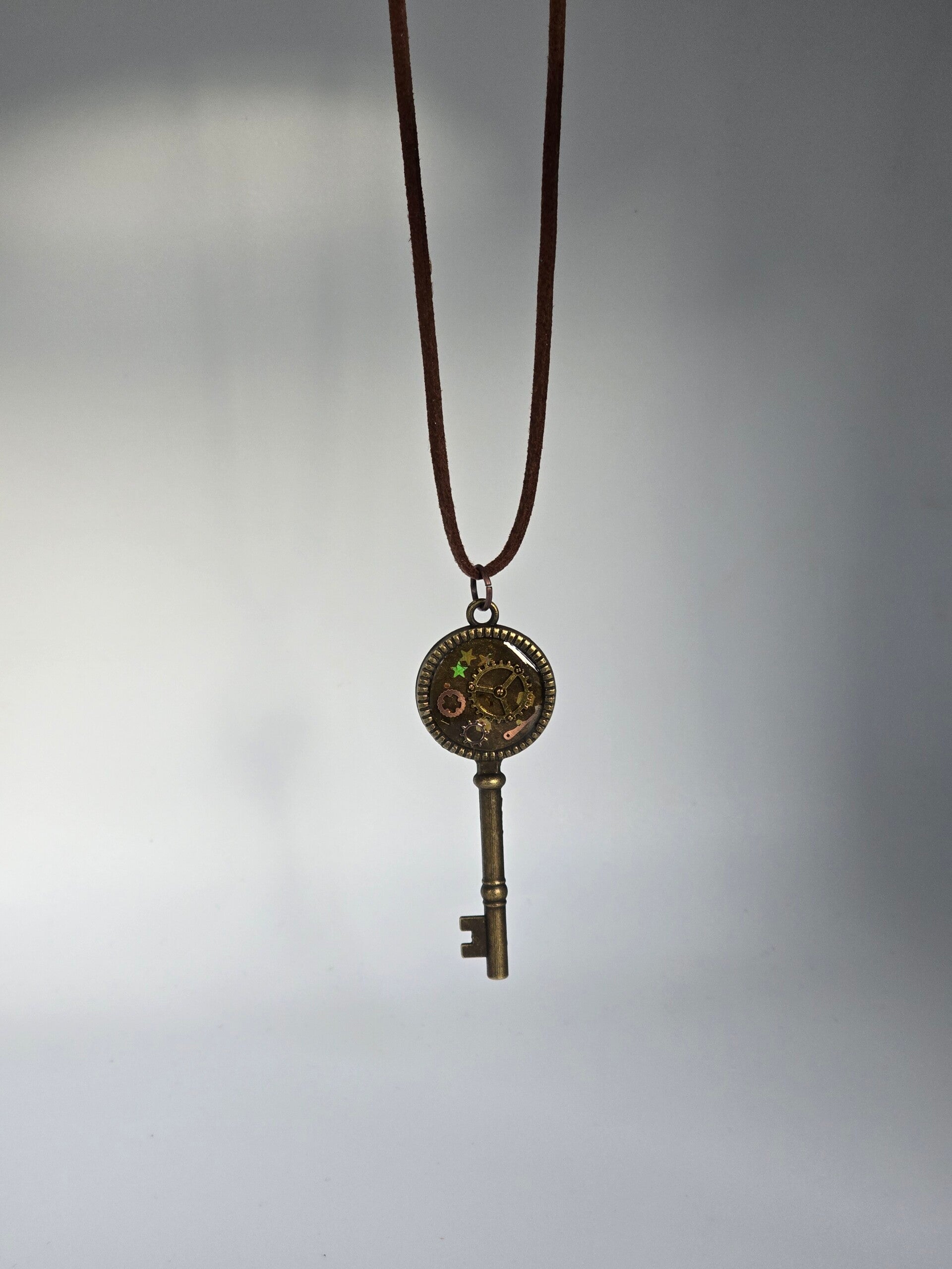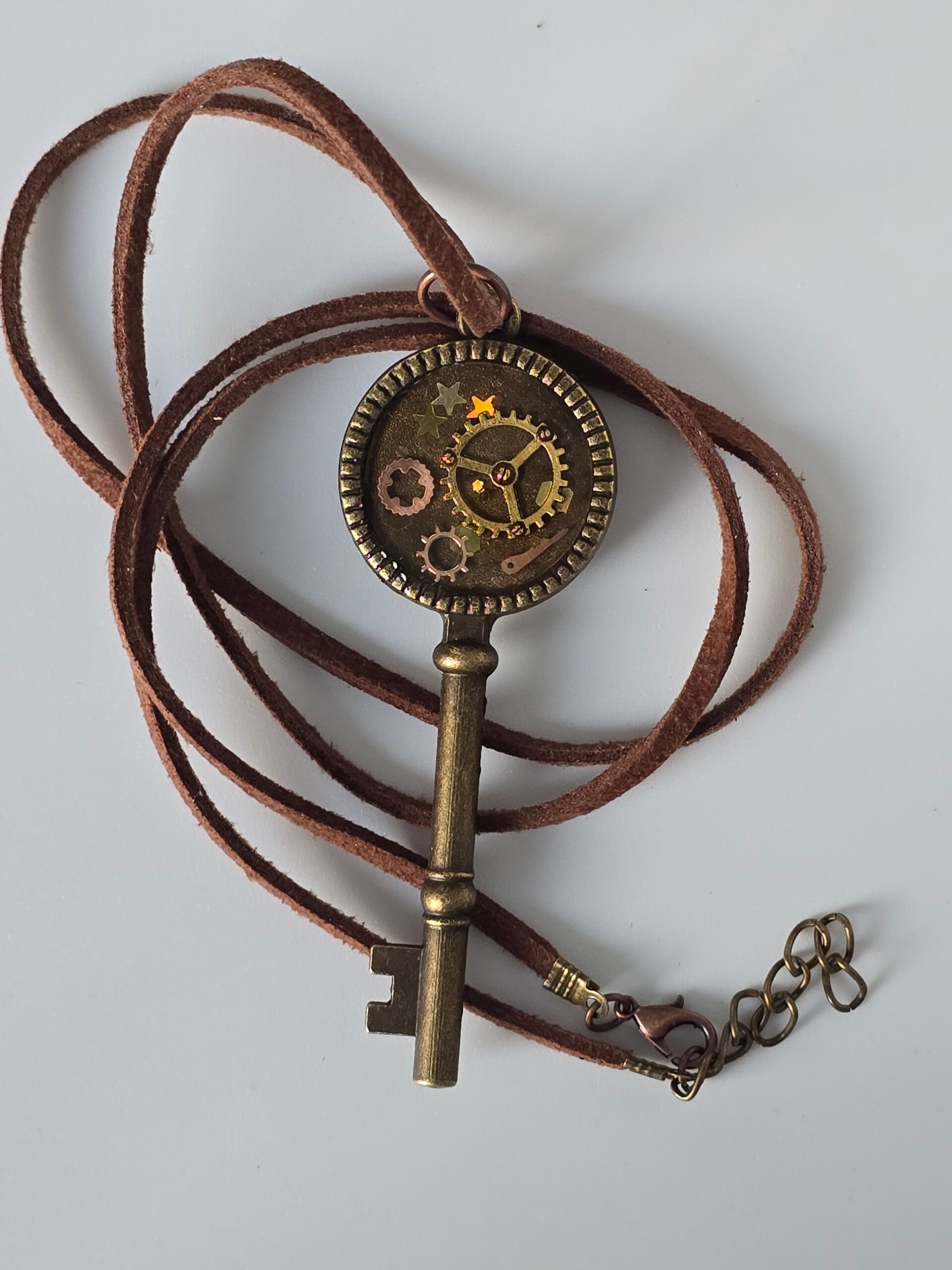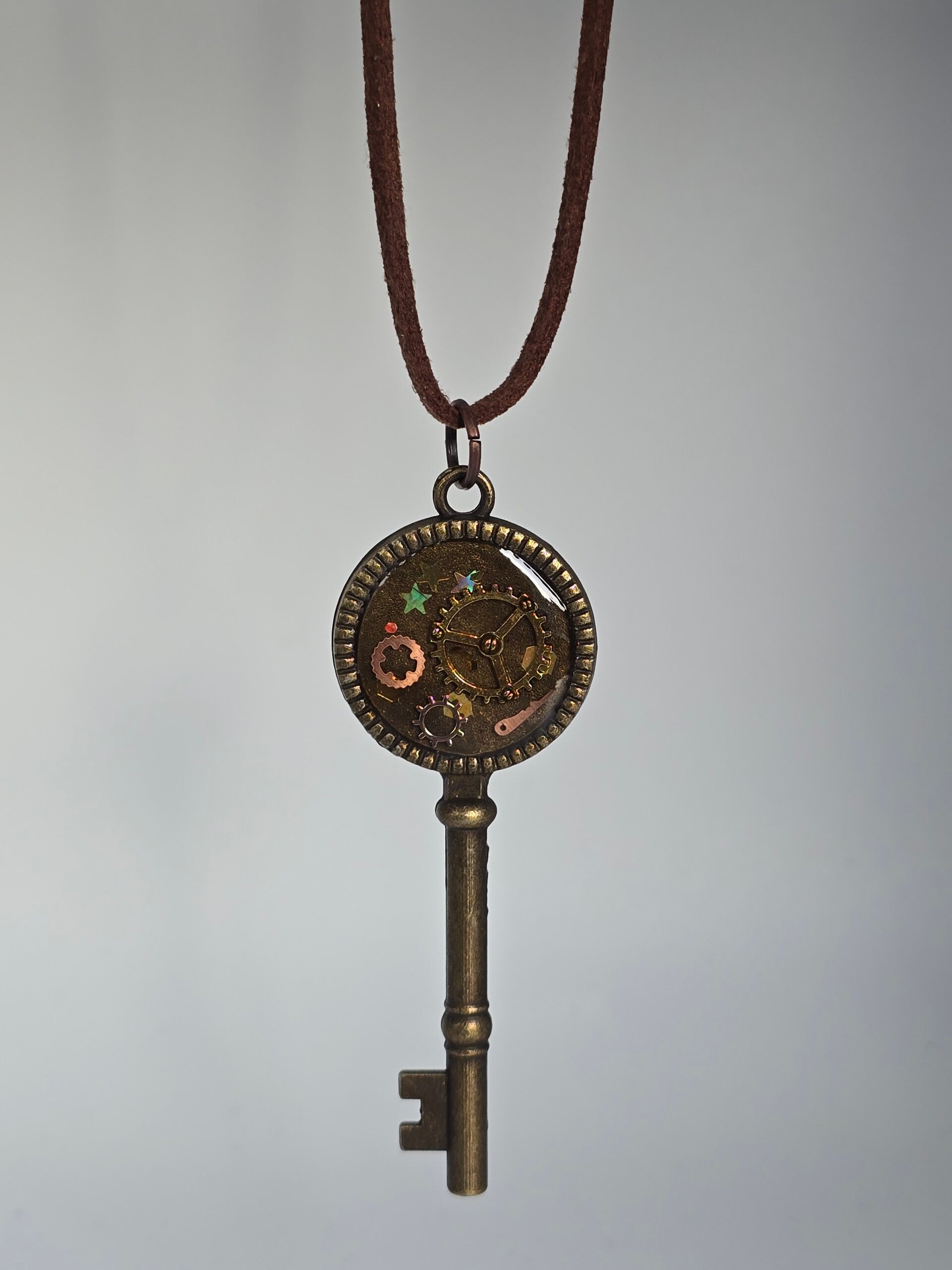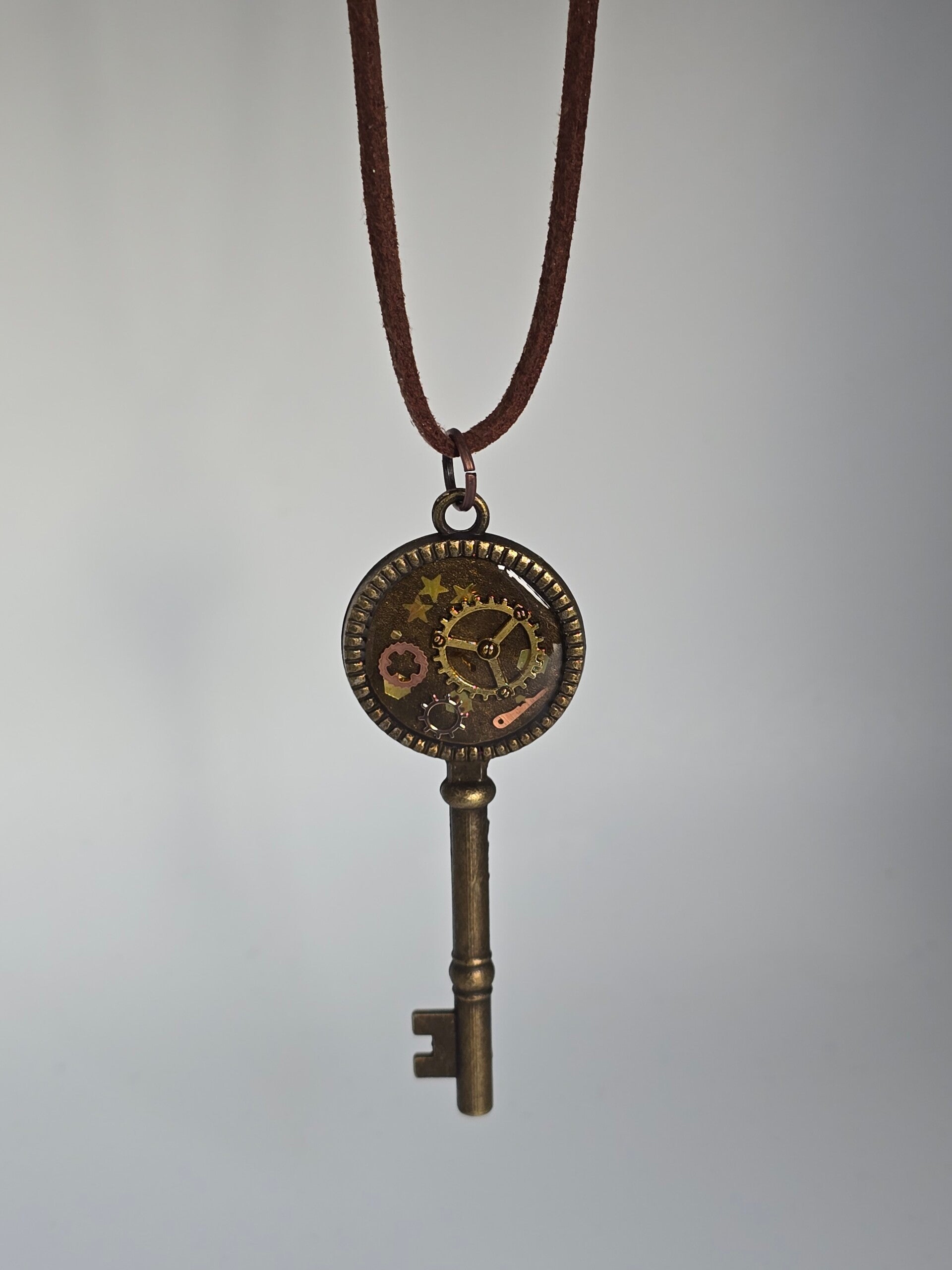 Ontdek de magie van Steampunk met deze unieke sleutelketting! In de bronskleurige hanger schittert een mysterieus mechaniek van echte tandwielen en kleine sterretjes, prachtig gevangen in een heldere laag hars. Het robuuste ontwerp aan het bruine suède-look koord geeft elke outfit direct een stoer en vintage karakter. Dankzij de verstelbare sluiting draag je dit handgemaakte sieraad precies op jouw ideale lengte. Een bijzonder accessoire voor wie houdt van een verhaal om de nek!
