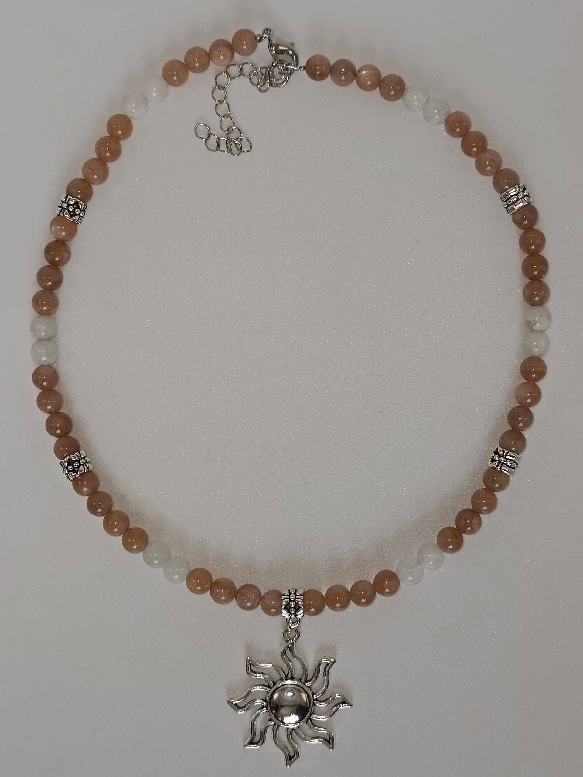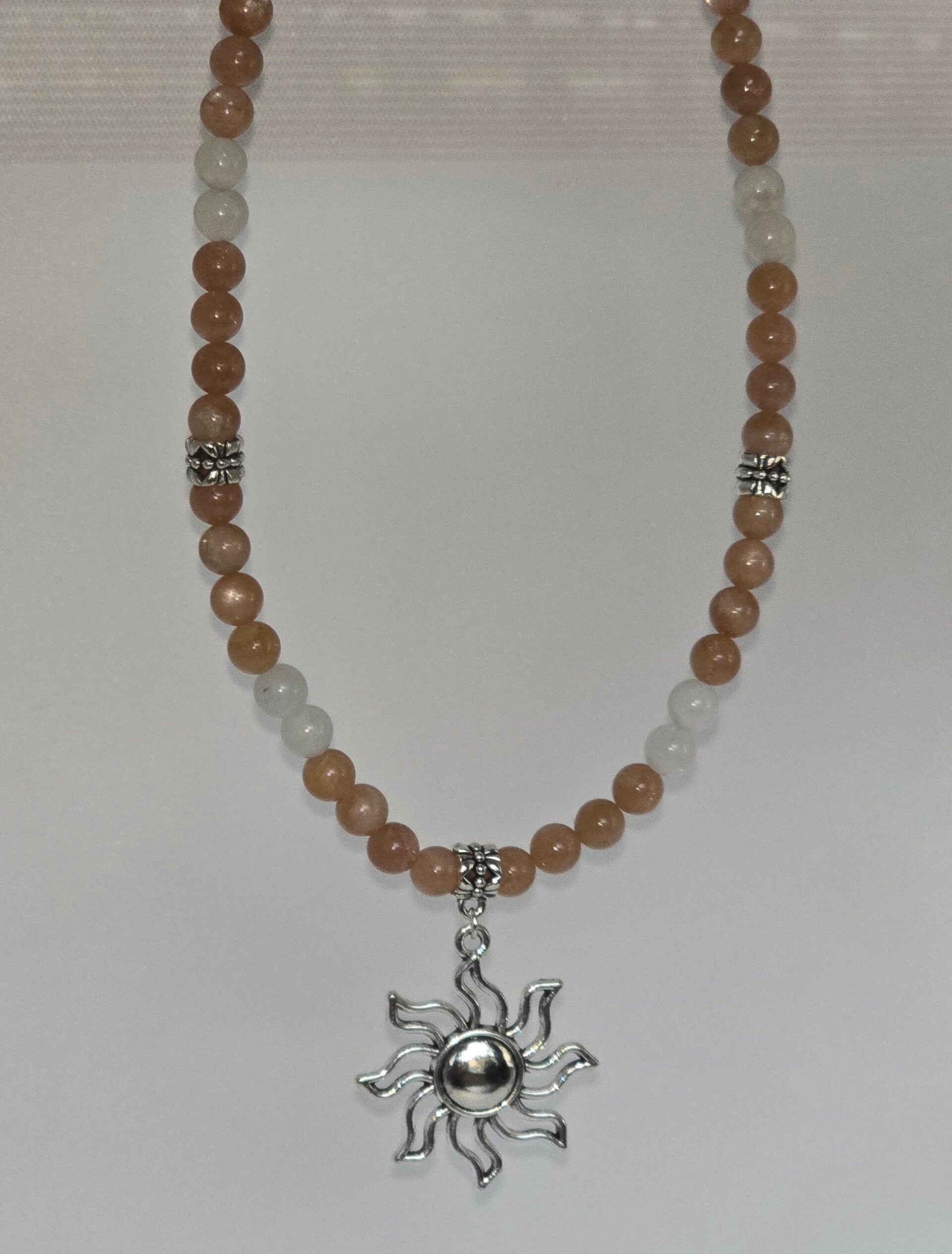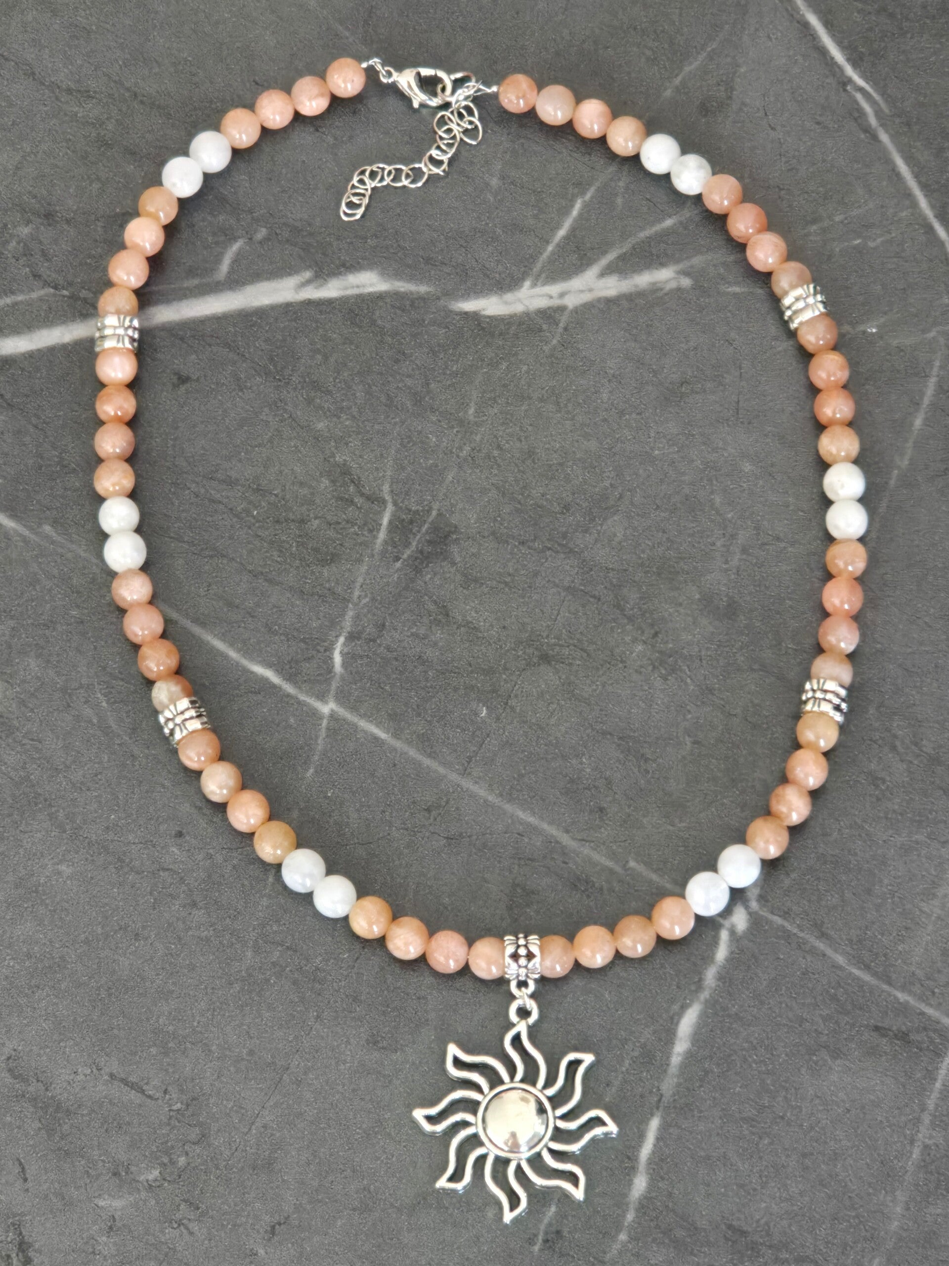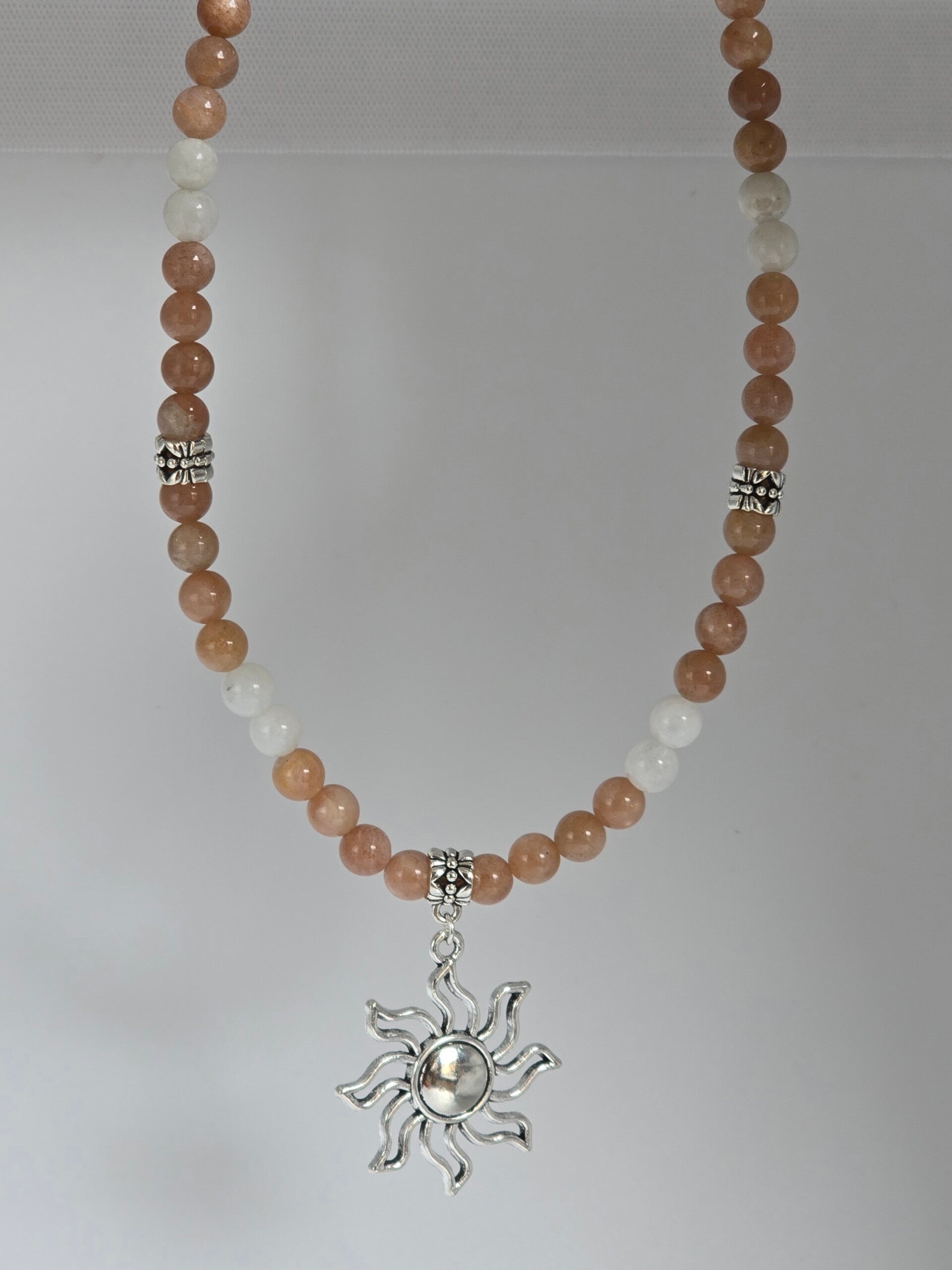 Draag de kracht van de zon en de rust van de maan met deze unieke ketting van Zonnesteen en Maansteen. Een handgemaakt sieraad dat optimisme en intuïtie prachtig combineert. De gedetailleerde zonnehanger vormt het stralende middelpunt van dit betekenisvolle ontwerp.
