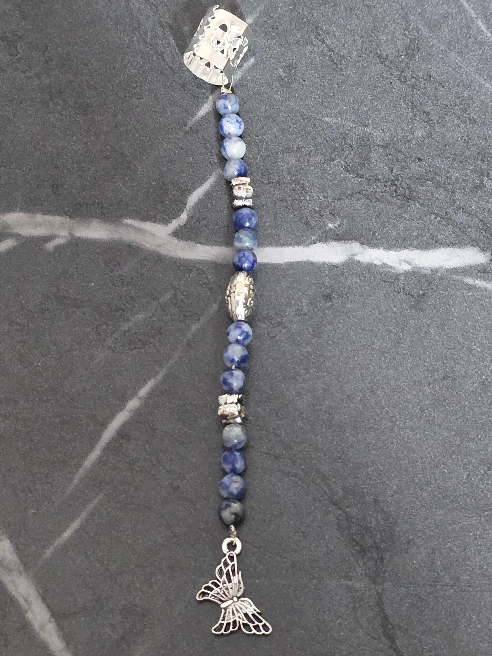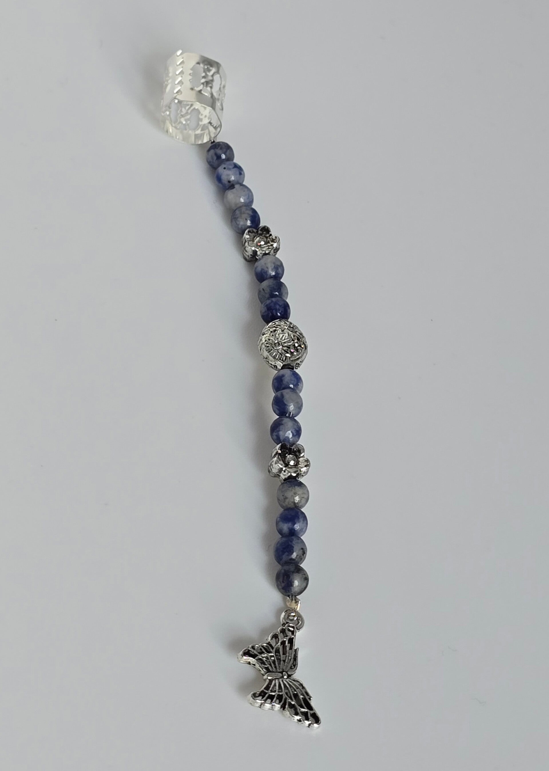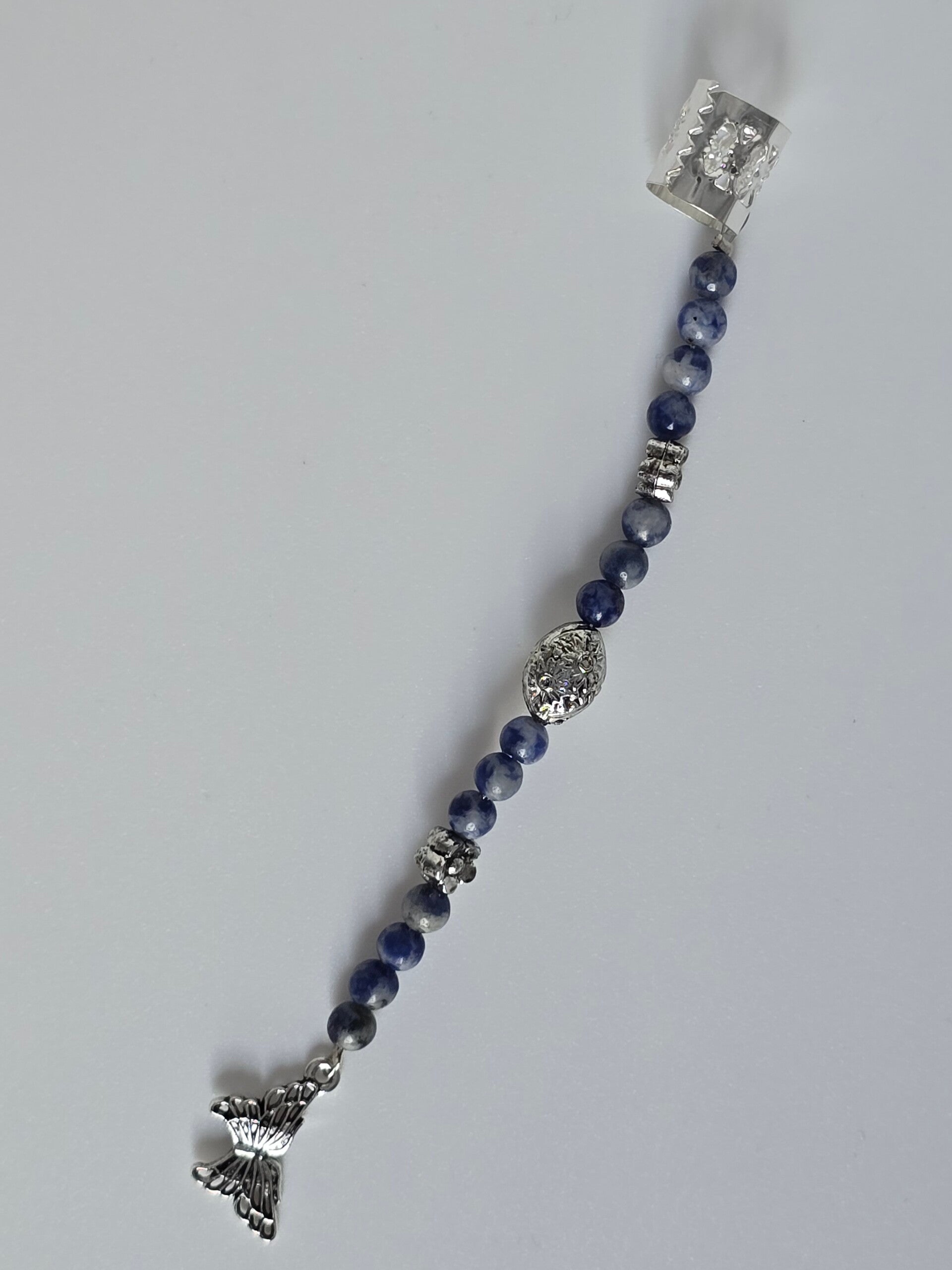 Voeg een vleugje magie toe aan je haar met deze handgemaakte dreadlock hanger. De bead bestaat uit een reeks diepblauwe Sodaliet kralen, afgewisseld met gedetailleerde zilverkleurige kralen. De hanger wordt compleet gemaakt door een prachtige zilverkleurige filigraan vlinder bedel en is eenvoudig te bevestigen met de cuff met opengewerkt motief. Een uniek en betoverend accessoire voor een persoonlijke look.