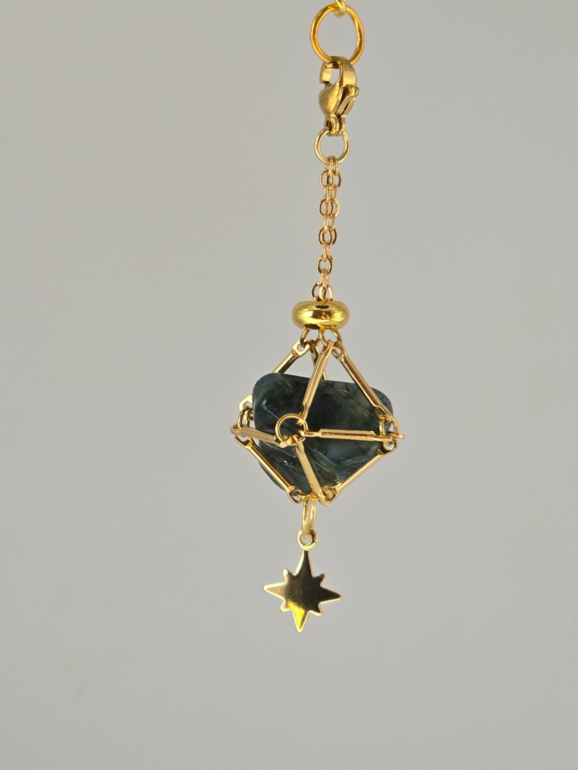 Breng een stukje natuur en rust met je mee dankzij deze handgemaakte goudkleurige sleutelhanger. Dit unieke accessoire bevat een prachtige, ongeslepen Mosagaat edelsteen, bekend om zijn fascinerende groen-witte patronen die doen denken aan een boslandschap. De steen is veilig gevangen in een stijlvolle geometrische kooi. Een sprankelend sterrenbedeltje aan de onderzijde maakt het betoverende ontwerp helemaal af. Met de stevige ring en ketting is het een ideale blikvanger voor aan je sleutelbos of tas, maar ook een prachtig en betekenisvol cadeau.