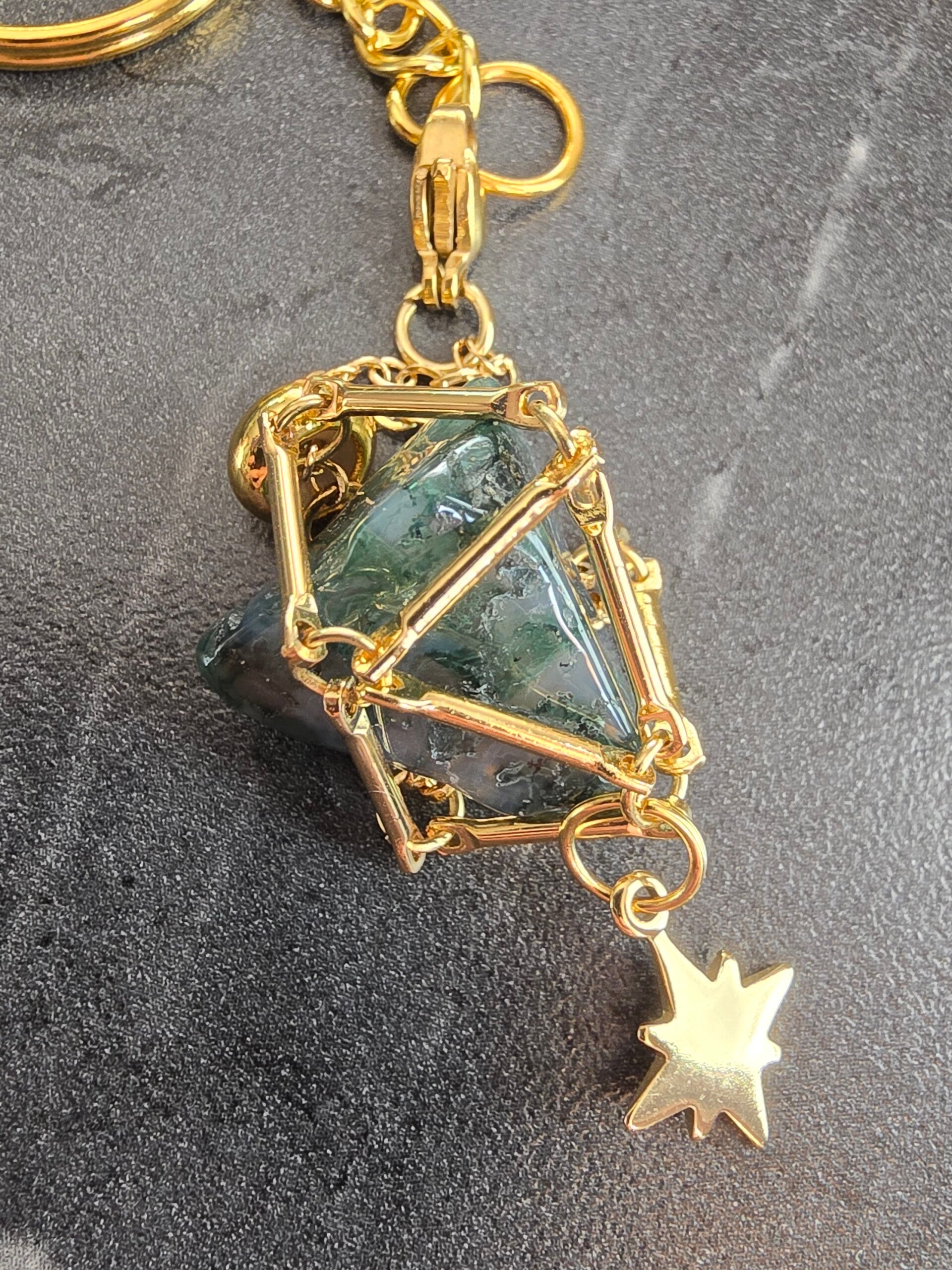 Goudkleurige sleutelhanger met Mosagaat en ster