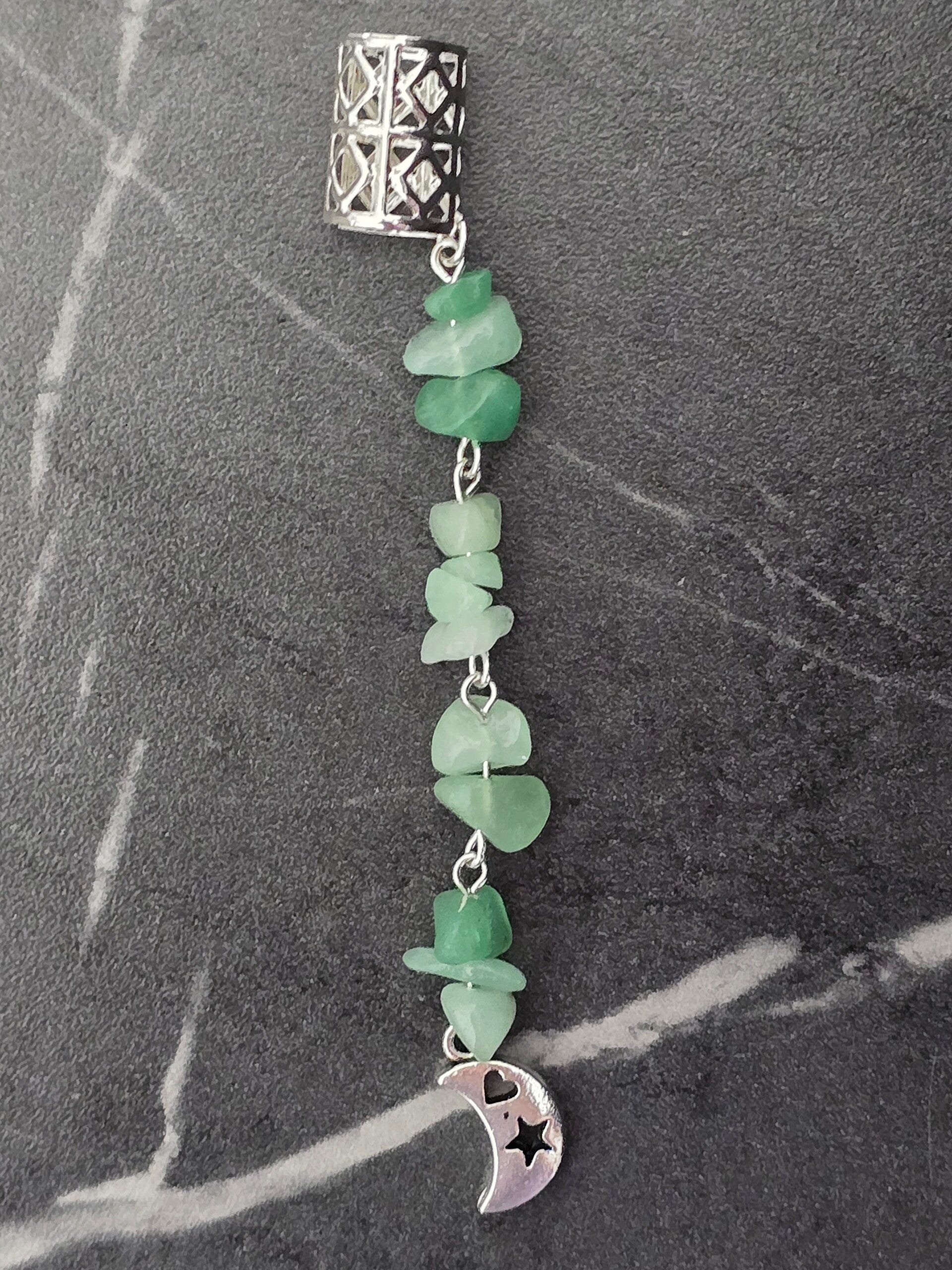 Voeg een vleugje natuur en mystiek toe aan je kapsel met deze compacte zilverkleurige haarcuff. Met een lengte van 8,5 centimeter is deze charm perfect voor een subtiele maar unieke look. De hanger is versierd met frisse groene aventurijn-steentjes en eindigt in een speels maantje met ster- en hartdetails.