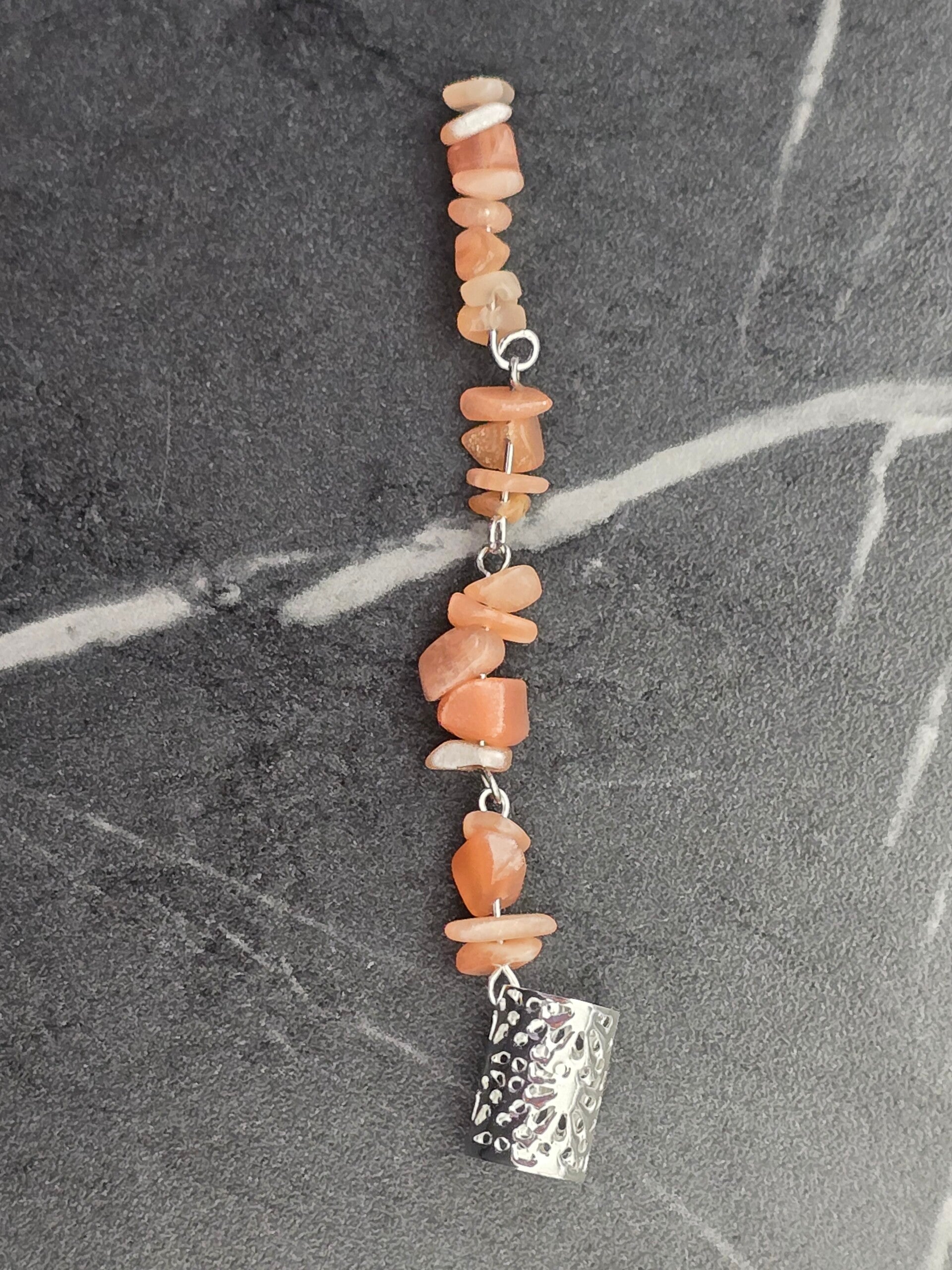 Geef je kapsel een warme en energieke uitstraling met deze handgemaakte haarcuff van 8 centimeter. De hanger is volledig opgebouwd uit natuurlijke zonnesteen-chips, die prachtig glinsteren zodra het daglicht erop valt. Zonnesteen staat symbool voor positiviteit en kracht, wat dit sieraad niet alleen mooi maakt, maar ook een bijzondere betekenis geeft.