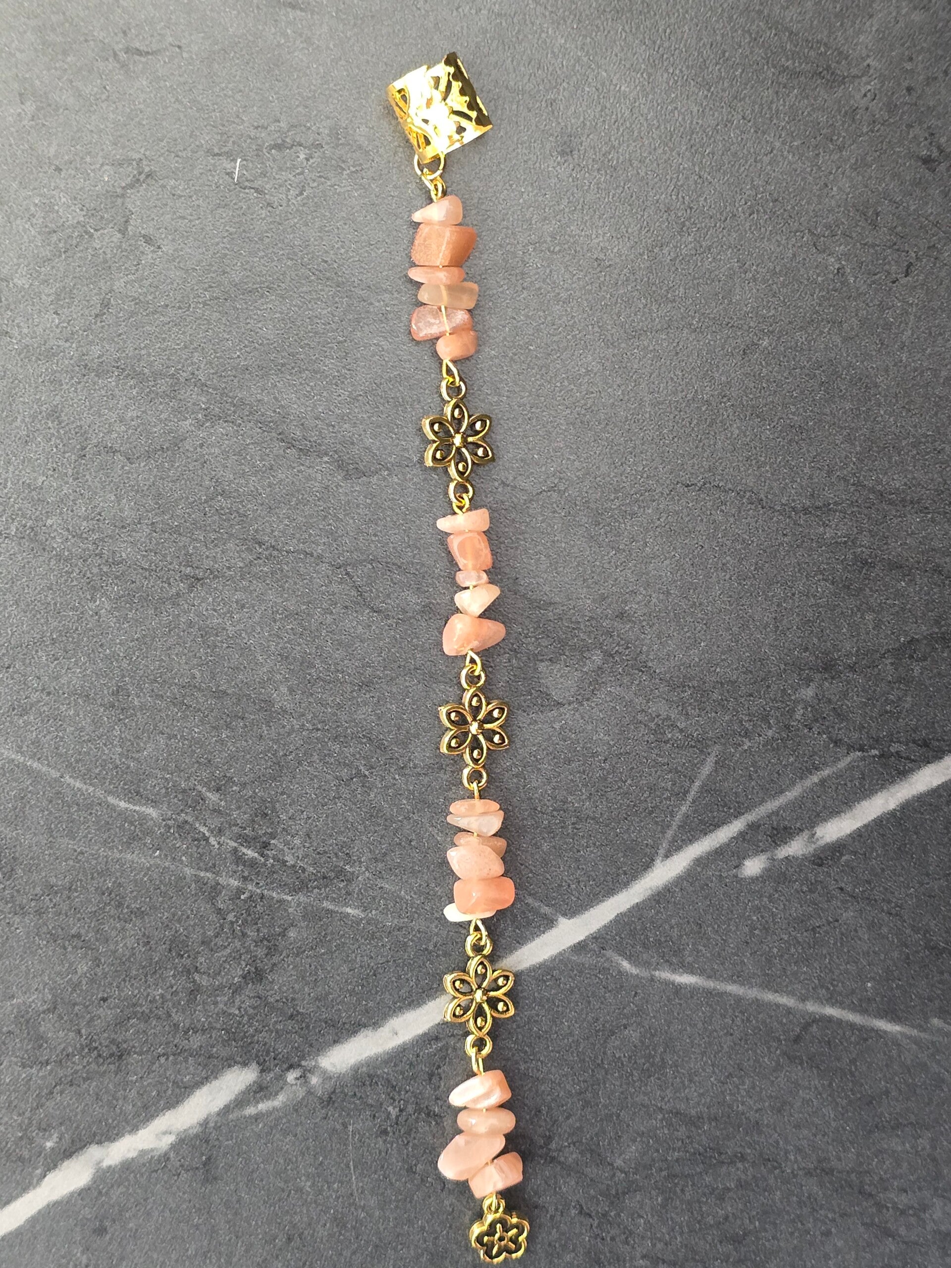 Geef je kapsel een unieke, bohemian uitstraling met deze prachtige handgemaakte haarring van 9 centimeter lang. Dit sieraad is de perfecte finishing touch voor een festival-look, een zomerse vlecht of gewoon om je dagelijkse stijl wat extra karakter te geven. De basis bestaat uit een zilverkleurige cuff met een verfijnd opengewerkt patroon, die je eenvoudig om een pluk haar of een vlecht schuift.